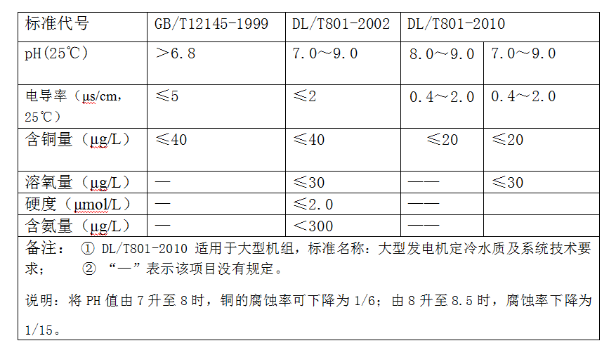 國內(nèi)不同時(shí)期執(zhí)行的定冷水水質(zhì)標(biāo)準(zhǔn)